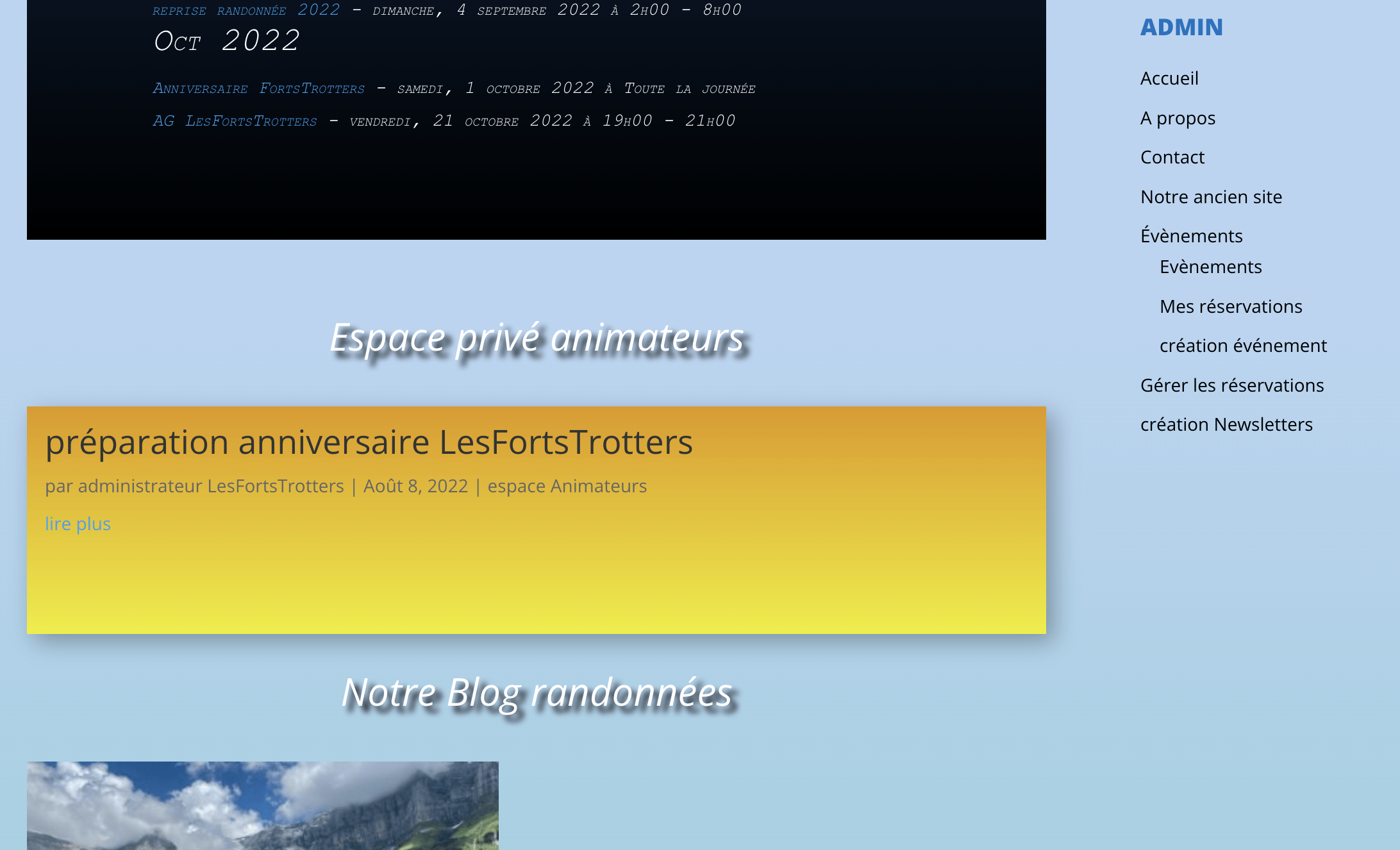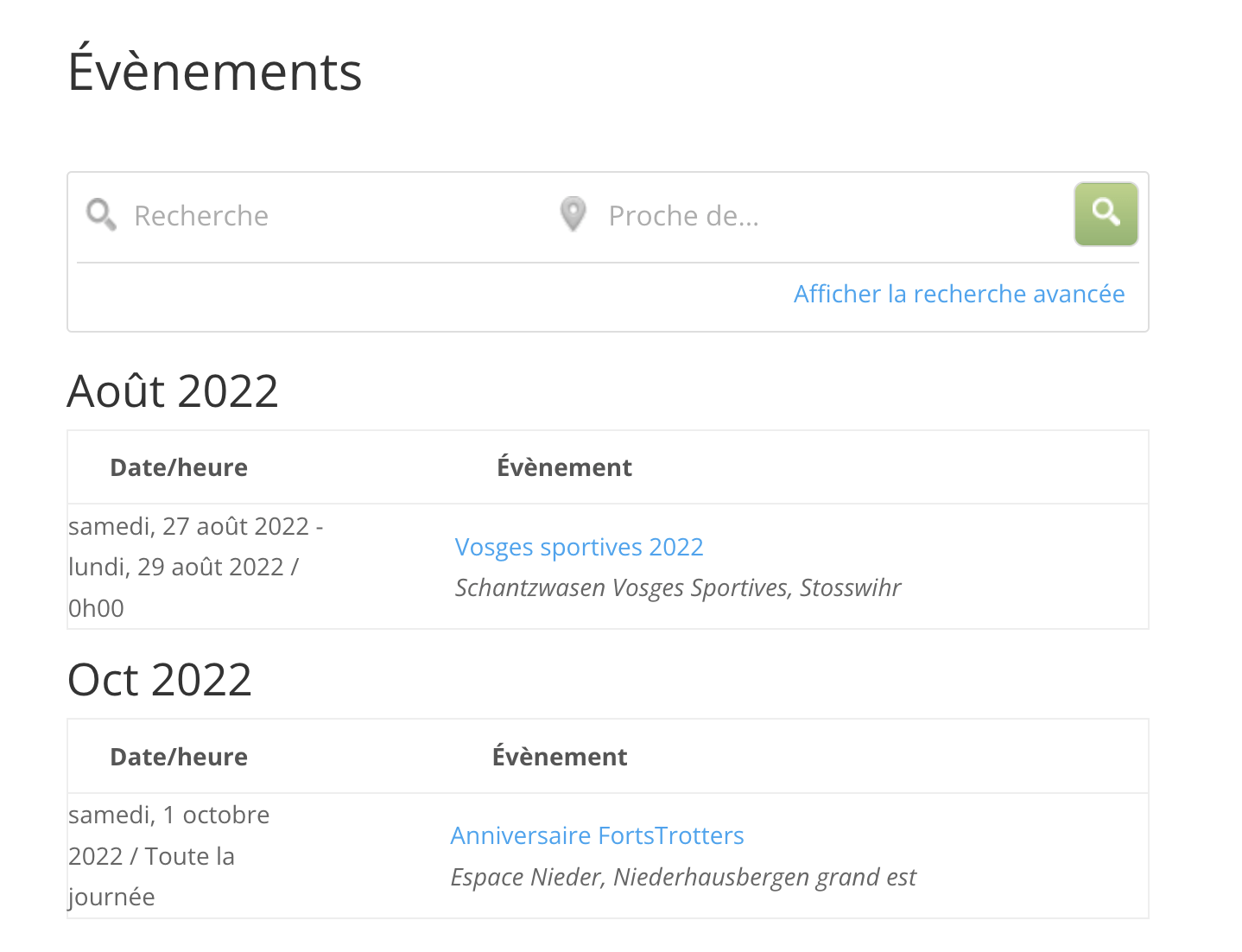 Un exemple avec deux événements à venir pour notre association, un de type randonnée et un de type événement LesFortsTrotters.