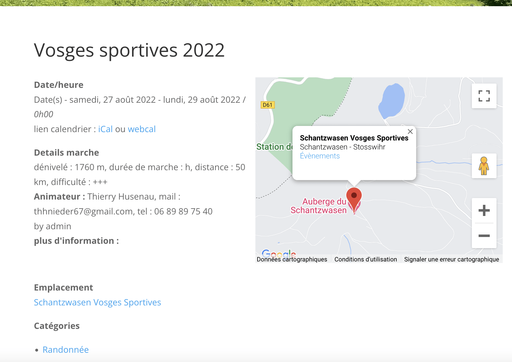Voici un événement de type randonnée géolocalisé avec un affichage spécifique pour les attributs.