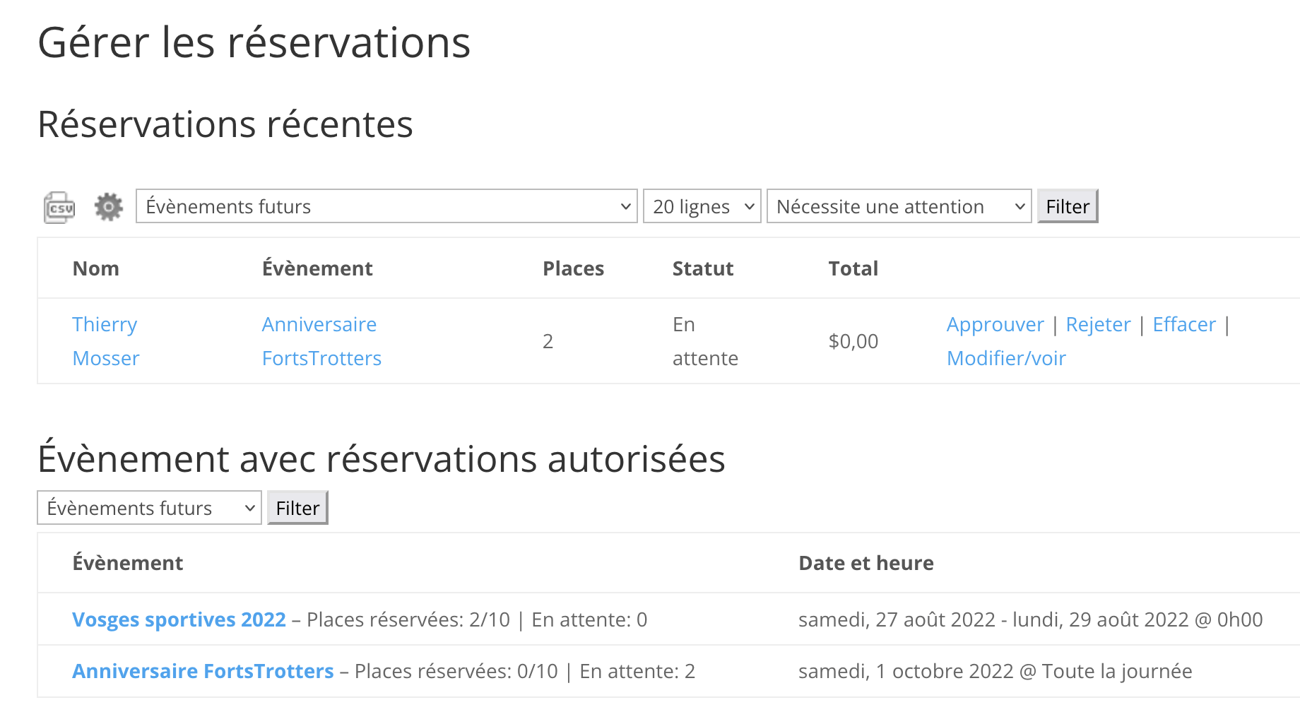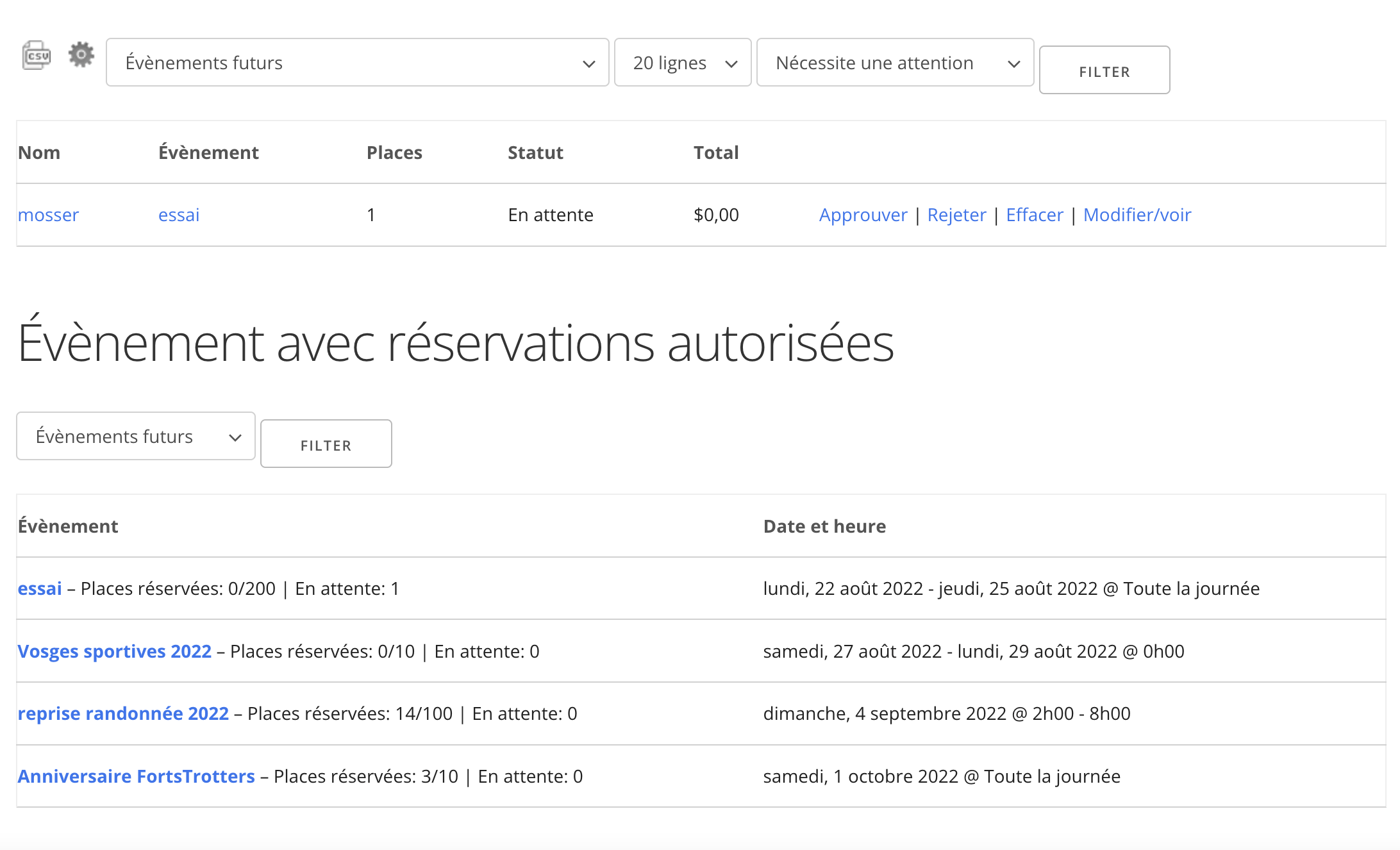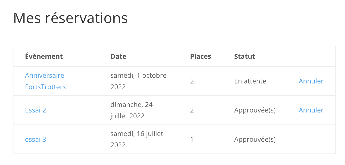 Pour chaque événement on voit le nombre de places, le nombre de places réservées et en attente de décision.