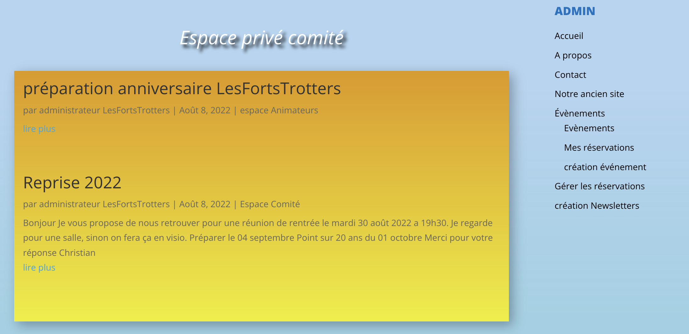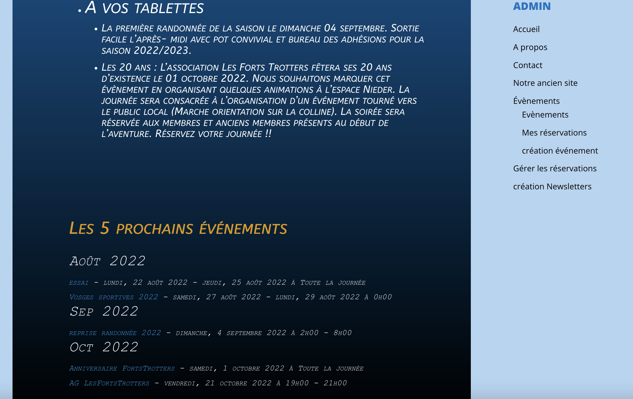 - le menu visible sur la droite dans la page d’acceuil sera contextuel, en fonction de vos droits, vous verrez plus ou moins d’éléments de ce menu. La gestion des réservations aux événements par exemple ne sera accessible qu’aux personnes connectées, l’option ne sera pas présentée au visiteurs du site (par définition non loggés).