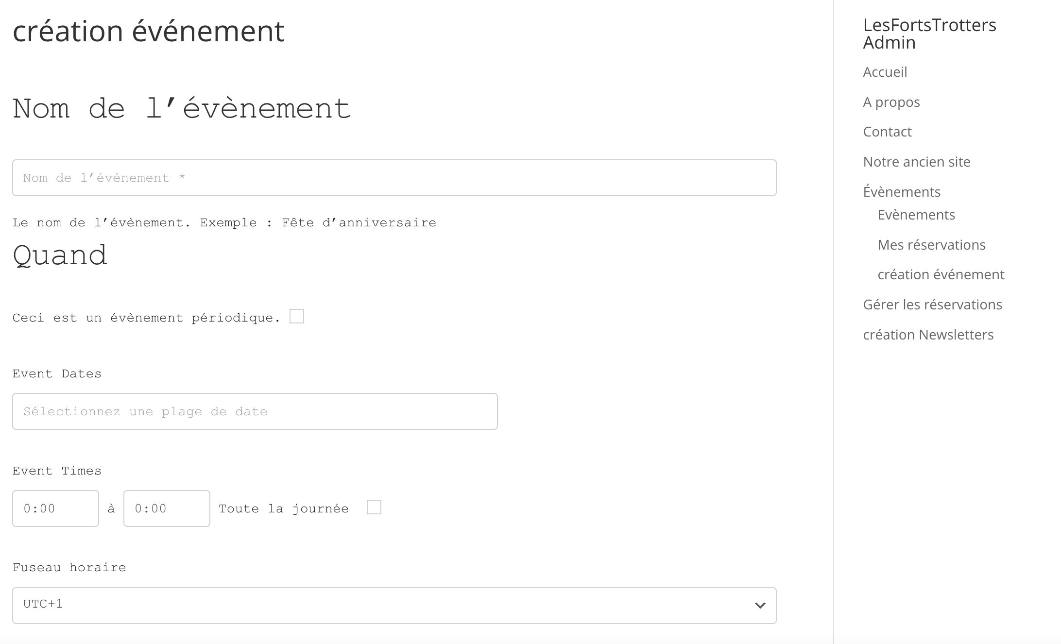 Voici le prototype de gestion des événements FortsTrotters. Le mécanisme est assez complet, il permet, de créer des événements et de les afficher sous forme de liste ou d’agenda. Chaque événement est géolocalisé par Google Maps et est caractérisé par des attributs spécifiques aux événements de type randonnée : nb de km, dénivelé, durée de marche, difficulté, nom de l’animateur, téléphone, mail). Les personnes se connectant sur le site peuvent consulter les événements et enregistrer leur participation. Des mails sont automatiquement échangés avec eux pour confirmer les réservations. L’administrateur ou des personnes ayant des droits particuliers peuvent gérer les réservations.