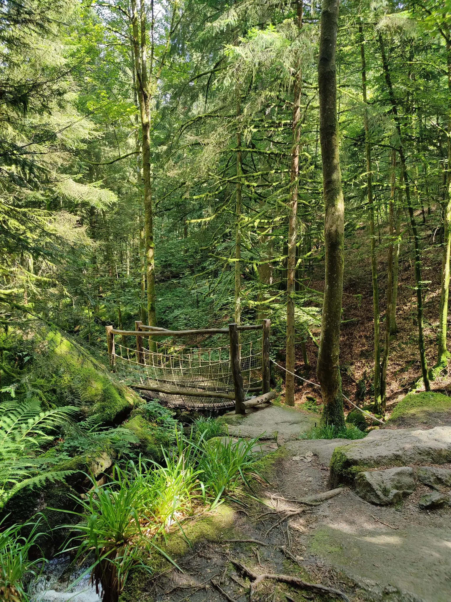 Entre pont de singe qui enjambe le Gertelbach et escaliers dans la pente, une formation rocheuse impressionnante, il y a toujours des points de vue intéressants à découvrir sur le sentier qui serpentent autour des rochers. Nous passerons aussi à un bel abris ou on nous explique tous sur le Lynx.